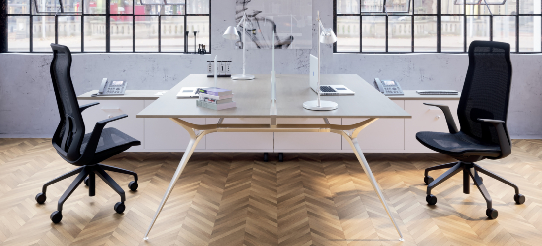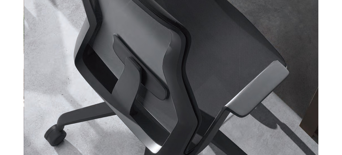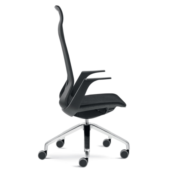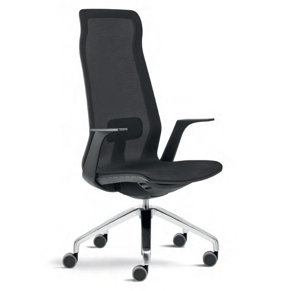 Costa: Alta e alta com secção de apoio de cabeça. Rede. Suporte lombar regulável em altura.Assento: Rede.Base giratória: Alumínio pintada a preto ou branco ou alumínio com acabamento polido.Mecanismo: Sincronizado. Regulação automática da tensão.Braços: Fixos.