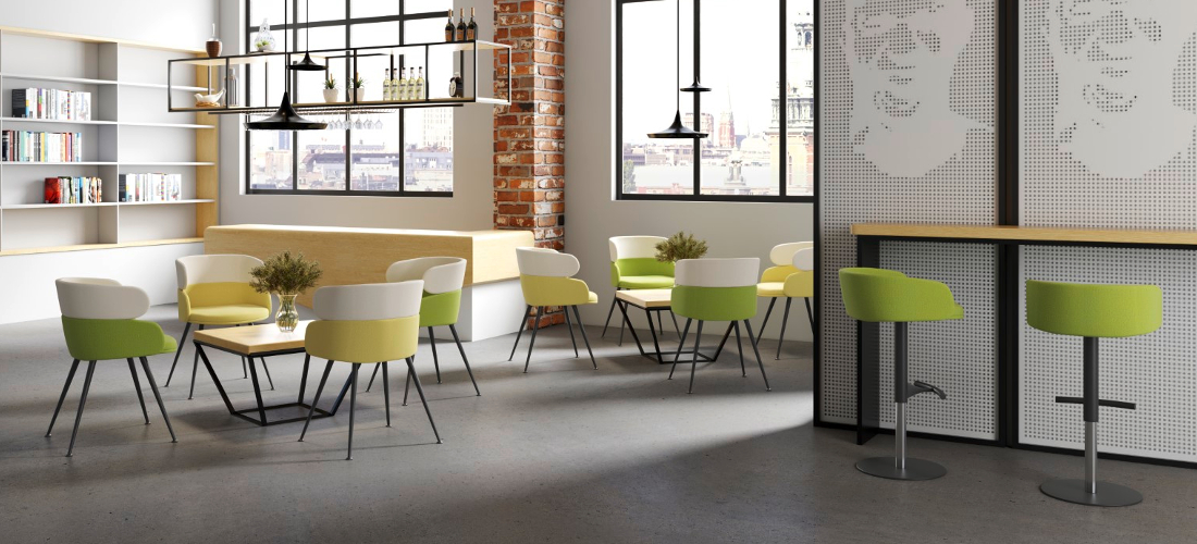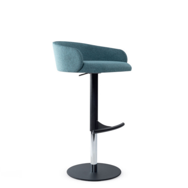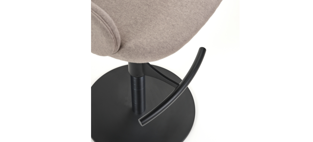 Banco alto: Apoio de pés e base circular com acabamento pintado a preto.